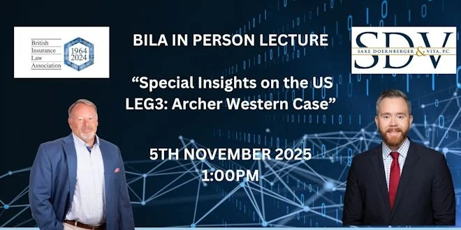 We are pleased to invite you to an in-person lecture at Lloyd’s Old Library on Tuesday, 5 November at 1:00 PM. Jeremiah Welch and Will Bennett of Saxe Doernberger & Vita P.C. will explore the recent Archer Western v. ACE American Insurance Co. decision and its implications for LEG3 coverage interpretation under U.S. law. They will analyse how the court’s reasoning, influenced by SCB, redefines “physical damage,” clarifies ambiguity surrounding “improvement” in LEG3 provisions, and contrasts U.S. and U.K. treatment of manufacturing and contamination claims. The session will offer essential takeaways for insurers, brokers, and construction professionals engaging with cross-jurisdictional coverage disputes.